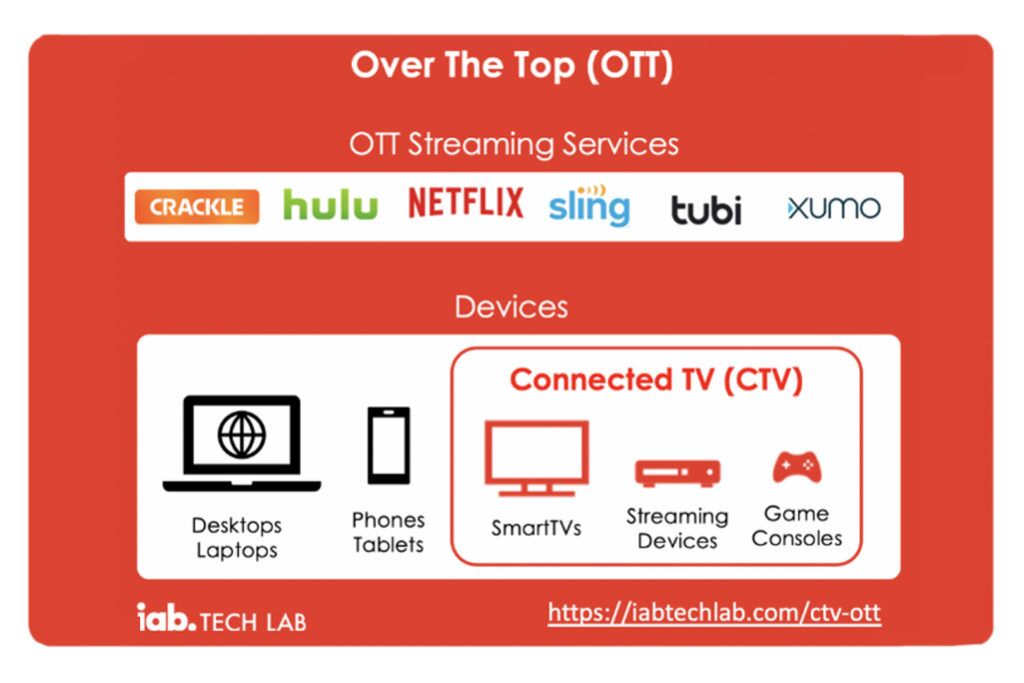 CTVs are part of the overall OTT universe that encompasses any video content or service that can be streamed via the internet, such as Netflix, Disney+, and Amazon Prime Video. The term “Over-the-Top” refers to the method in which the content is served – meaning over the top of the “box” services like traditional cable or satellite TV. It’s important to make the distinction, as these two terms often get mixed up. It helps to think of the two as working together – OTT delivers the content and CTVs are the some of the outlets or devices that the content is served on. CTV advertising is the ad content you’ll see on CTVs.